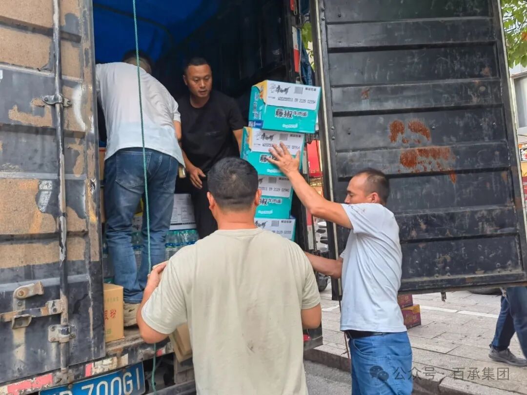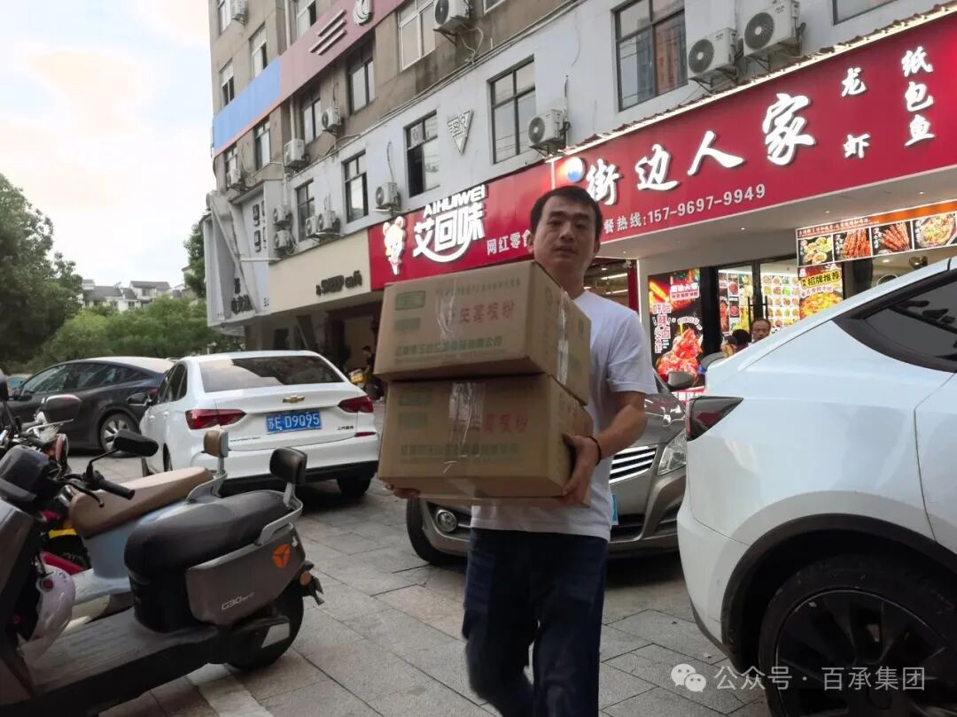 6月23日,百承集团副总经理毛昊强、经理朱小明代表集团将捐赠物资搬运装车,满载着爱心物资的车辆从百承控股集团出发,驶向桑植灾区。